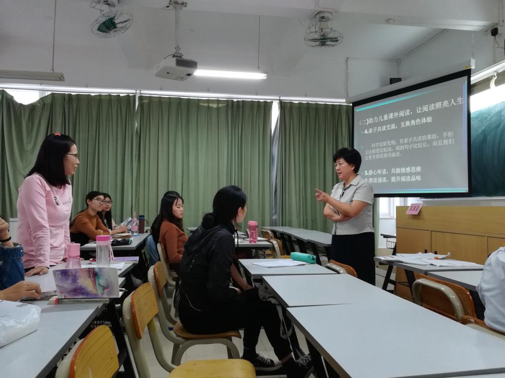 的研究生们介绍了小学生阅读能力培养的方略。王老师以新锐的观点、前沿的视角和鲜活的第一手材料,集中探讨以下三个问题:一是为什么如此重视阅读能力培养?二是广州市小学生阅读力水平如何?三是如何培养小学生阅读素养?