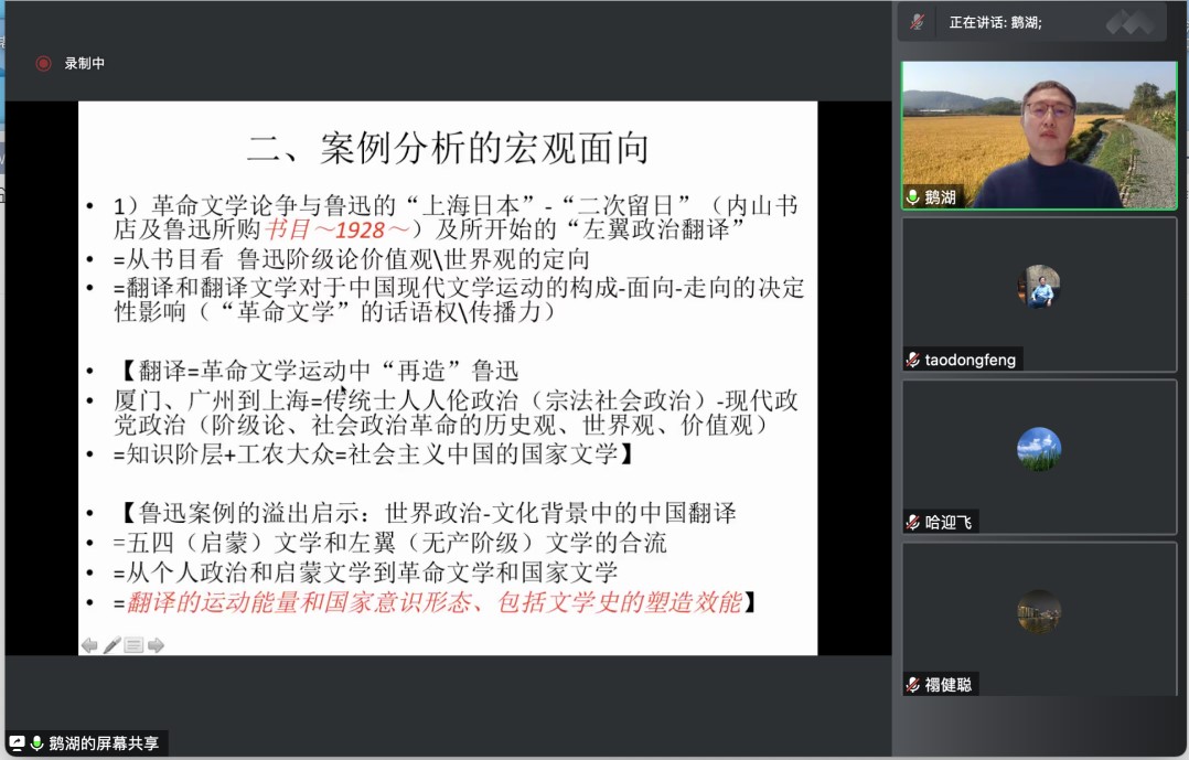 艺文讲坛第五十二讲在线上举行。南京大学文学院教授、教育部 特聘教授吴俊先生应邀作题为“翻译的文学史构造功能——翻译文学与中国现当代文学”的学术报告。讲座由陶东风教授主持,哈迎飞教授与谈,禤健聪院长、李茂增副院长、戴登云教授以及学院两百余名师生参加了本次讲座活动。
