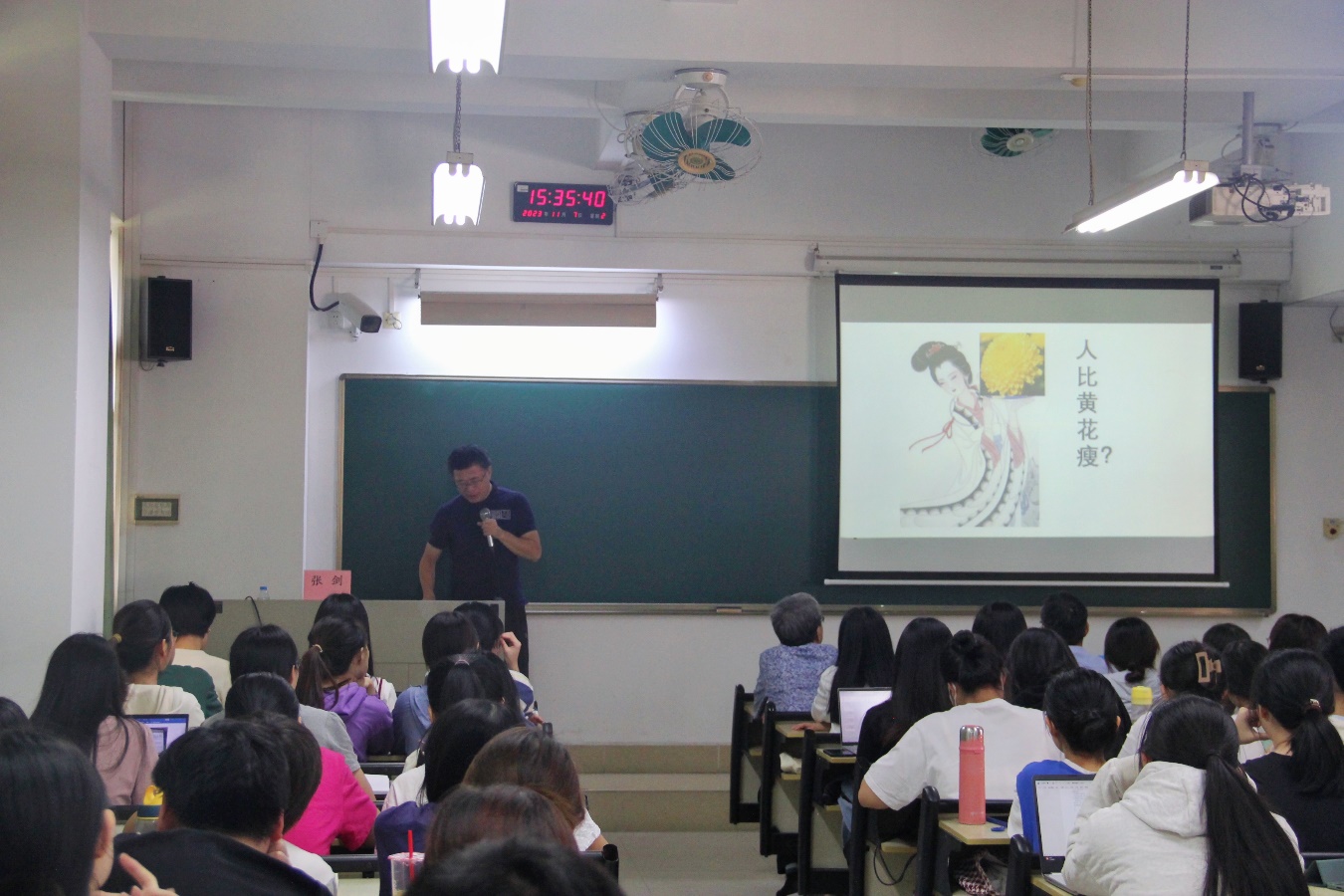 讲座伊始,张剑教授引用苏联教育家苏霍姆林斯基关于教育目的之观点开篇,指出随着教育的深入,同学们对问题的探讨逐渐从确定性发展为开放性。张剑教授点明,人文学科教育最重要的是对思维开放性的培养,文学在其中发挥着重要作用。文学是感性的,尤其是诗词中有多重意蕴等待读者开掘。