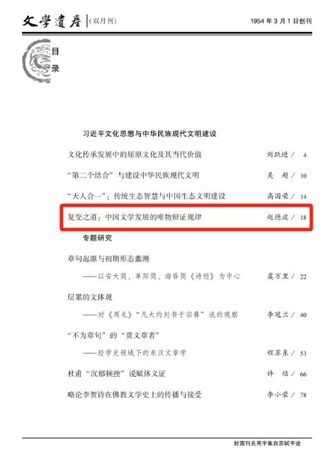 赵德波副教授在《文学遗产》(2024年第1期)“习近平文化思想与中华民族现代文明建设”专栏发表理论文章《复变之道:中国文学发展的唯物辩证规律》,以辩证唯物主义视角阐释中国文学发展过程中的复变之道。