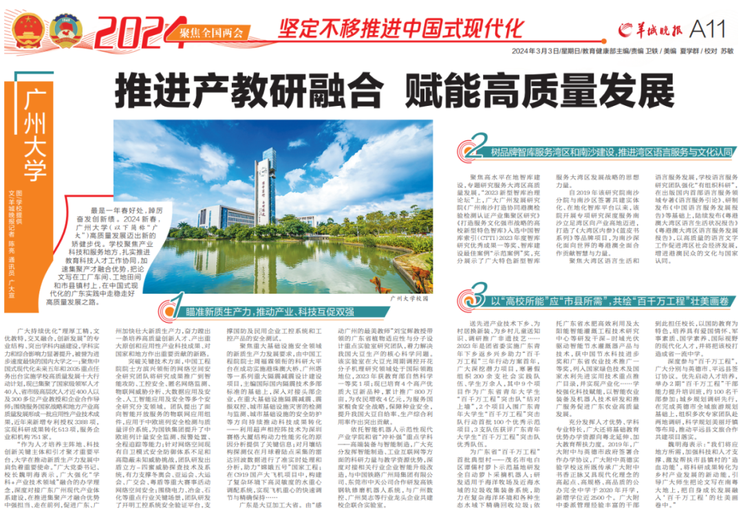 (以下简称“广大”)高质量发展迈出新的矫健步伐。学校聚焦产业科技和服务地方,扎实推进教育科技人才工作协同,加速集聚产才融合优势,把论文写在工厂车间、工地田间和市县镇村上,在中国式现代化的广东实践中走稳走好高质量发展之路。