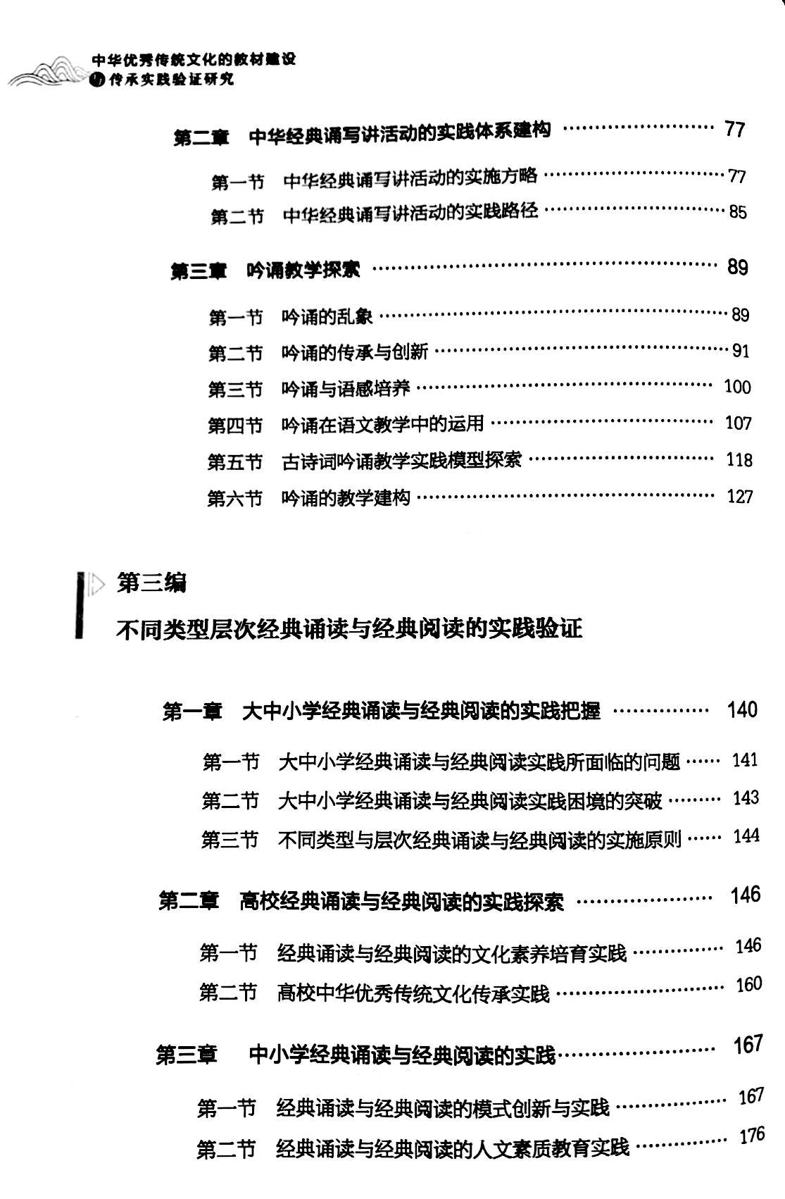 教材是优秀传统文化传承的核心载体,本课题项目组认为应以教材建设为手,将大中小学各学段的优秀传统文化教育融会贯通,打造一体性、互为呼应的优秀传统文化教育内容。本课题项目组以《中华经典诵读选本》做了尝试,该选本选取的百篇经典篇目中,来自小学、初中、高中阶段经典篇目占总篇目的50%,其余50篇为大学阶段的新增篇目,目的是让中华优秀传统文化教材文本在大学阶段有-体性的照应,同时也能一定程度上体现出延展,这样有利于国民经典教育在大学阶段能有一体性、系统性的夯实跟进。