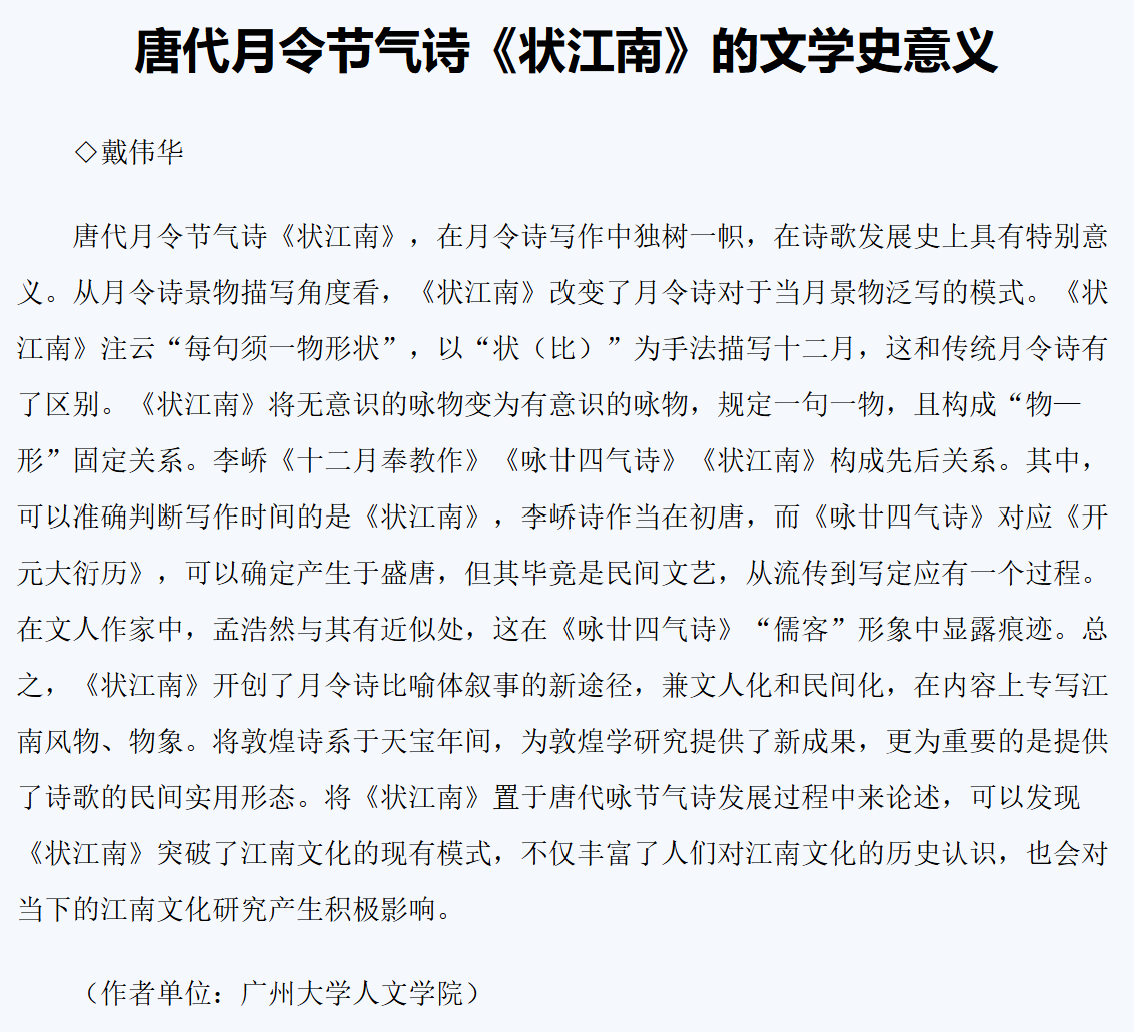 近日,广东省第十届哲学社会科学优秀成果奖评选结果公布,全省共有500项优秀社科成果获奖。《中国社会科学报》2024年6月19日刊出优秀成果观点摘要,其中包括吃瓜网 戴伟华教授的《唐代月令节气诗〈状江南〉的文学史意义》。