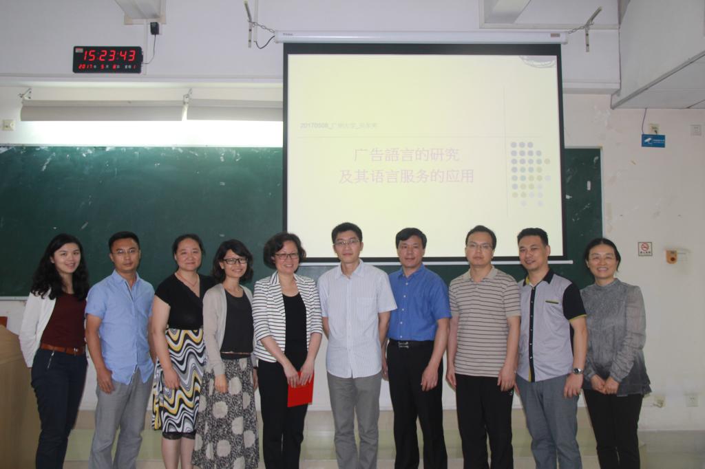 应用语言科学博士课程主任吴东英教授担任主讲嘉宾,为同学们讲授“广告语言的研究及其语言服务的应用”。副院长禤健聪,语言系主任马喆等教师代表和学生代表们一起聆听了本次讲座。同时,吴教授受聘为吃瓜网
