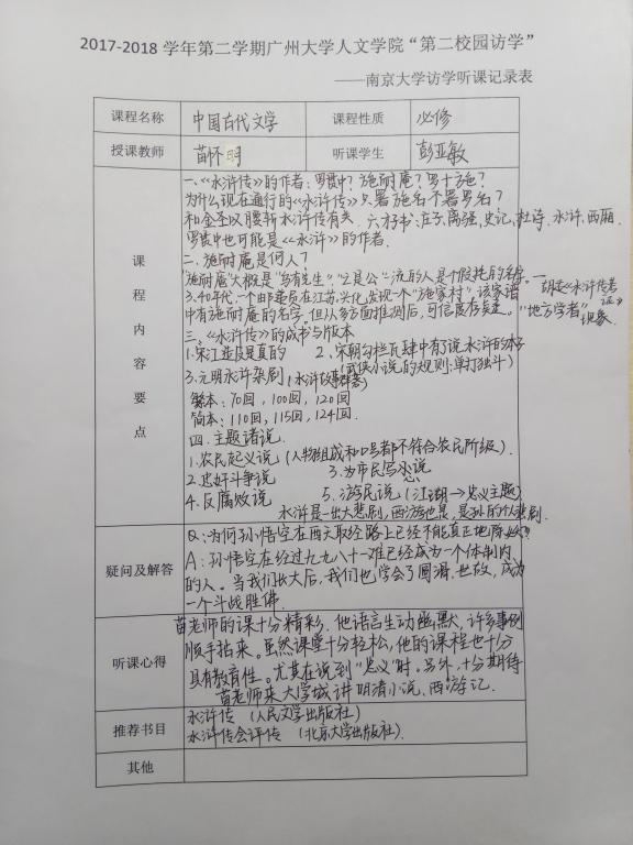 寓教于乐,启迪思考,是我们听完苗怀明院长的中国古代文学课程以后最深的印象。苗院长从《水浒传》的署名问题说起,讲到种种史料表明罗贯中也是实际参与创作《水浒传》的,但是现今通行的《水浒传》却只署名施耐庵,和清代评订六才子书的金圣叹腰斩水浒传有关,解决了中学时期就困扰我们的一个问题。再逐步引入成书与版本的问题,通过史料和考证,讲到最早的完整版本是京本忠义传,从忠义二字引发主题诸说的思考,从元明水浒杂剧的纵向比较引出跨文本的研究,与《三国演义》、《西游记》的横向比较让我们理解到书中呈现的道德悲剧:时代造就了奸臣和好汉,奸臣制造培养一批忠义的好汉又被奸臣消灭。课后对西游记的交流探讨,也使我们也非常期待能有机会邀请苗院长到广大为我们做相关内容的讲座。