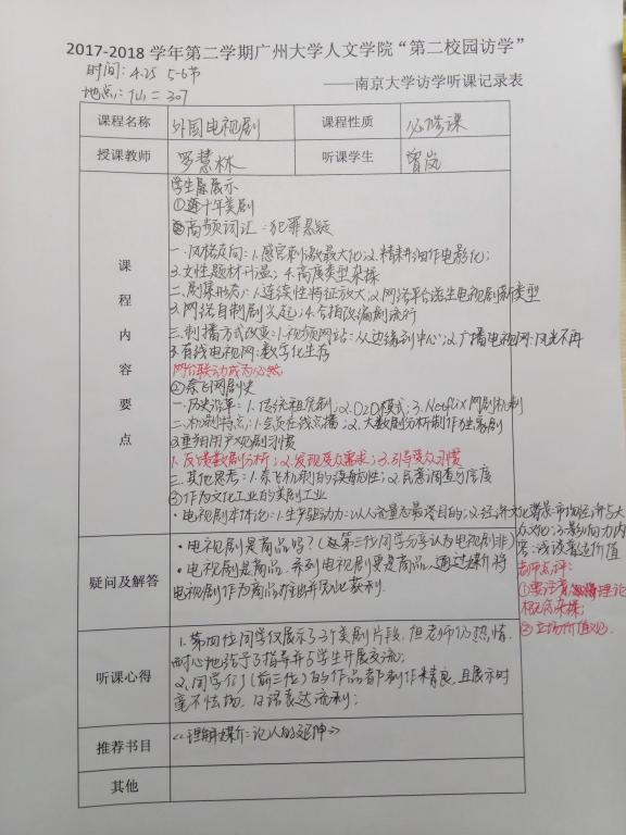 除了体验南京大学老师的授课以外,在外国电视剧课程中,我们也领略了南京大学学子的风采,在他们的展示中,我们也对比反思自身的学习方法和思考维度。本次课程是美剧组的同学进行分享,第一位同学从美剧的总体特征出发,以大视角展现了美剧追求感官刺激最大化、精耕细作电影化、女性题材回升但总体多类型题材杂糅、媒体传播连续性特征放大、制播方式改变等特点;第二位同学则选取奈飞网剧体制的角度切入,通过其历史沿革、机制特点及其传播方式的展示,一定程度上窥见美剧的特征与发展情况;第三位同学从美国电视剧产业作为文化工业的角度出发,从一定高度探讨了在现代市场经济与大众文化的背景下,电视剧逐步成为追求流量的商品从而冲淡普世价值是否合适的问题。