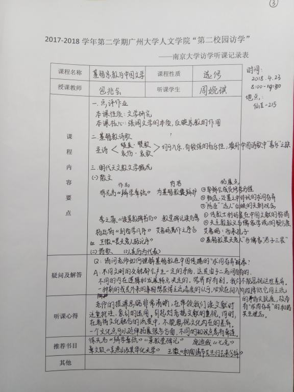 到访南大的几天,经历了春如四季。今天清晨拉开窗帘,惊艳地跟暖阳撞了个满怀,心情明朗。今天在听课与反思中度过,苗怀明教授的中国古代文学、程金宇教授的中国古代文物与文学、赵益教授的《论语》研究,上课内容风格各有特点,却给我同样的感受:他们既是传道授业、热情自信的授渔者,又是热爱学术、严谨治学的学者。老师们在课堂上神采飞扬、元气满满,他们全情地投入自己的课堂的同时也能感染学生,一步步引导学生汲取知识思考问题;此外,老师每提出一个观点都十分强调材料与例证的重要性,他们会给学生呈现大量的史料典籍,强调做研究不能被表象迷惑,要深入其中。这也让我想起我们学院的老师提醒我们“孤证不立”,做研究需要大量阅读并整合文献材料,提供准确深刻的例证。而令我印象最深刻的是老师们问题切入角度都比较新颖、研究发现有一定的突破性,从他们既投入又很享受的课堂中可以感受到他们对自己研究领域的热爱,他们也坦言这只是在兴趣驱动下无意研究的新发现。其实,这再次印证了 “喜爱自会投入”这句话。