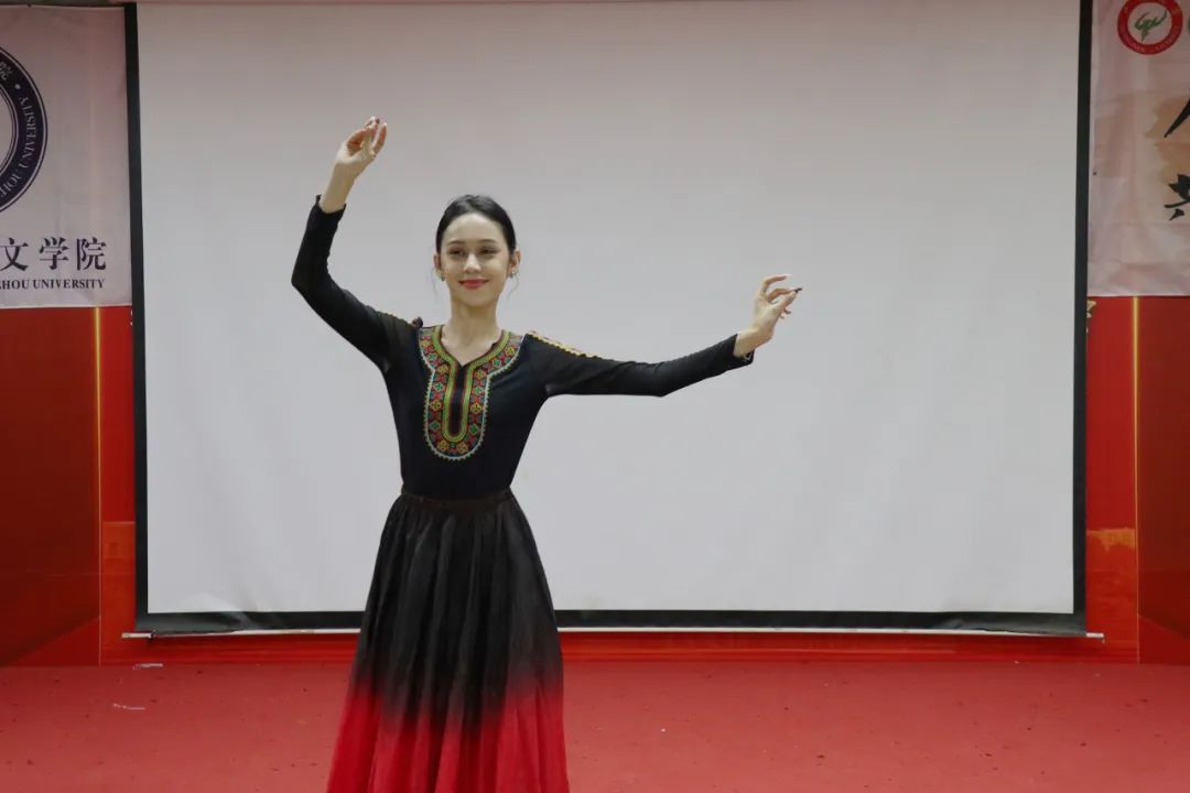 随后,她一身绯色舞裙,踩着节拍翩翩起舞,旋转跳跃中尽显少数民族文化的魅力。