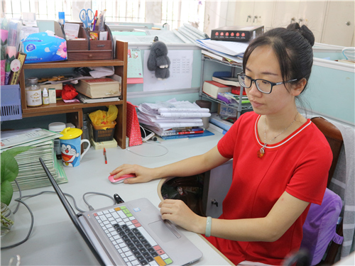 我们前去拜访她时,正好碰上了她所带的年级期末考出成绩的时刻,课间,一群活泼可爱的学生围在她办公桌前面有说有笑。对于当前所从事的工作,她表示很满足很享受。和其他高中生不同,她没有上高中,而是恰好赶上了一个好时代,直接学习了三年的师范技能训练,由此便比其他人积累和掌握了更多技法,正因如此,大学一毕业,她就如愿地找到了自己满意的工作。紧接着,吴子文老师跟我们聊起了她的学生们:“这些孩子真的很可爱,不会像小学生那么闹腾,也没有高中生那么大的学习压力,不那么深沉。”说完这句话,她迫不及待地跟我们分享起来一件她与学生发生的有趣的事情。“那天,我穿了一条裙子,裙子肩膀那里的设计是露肩。课后,一个小男生就走过来,支支吾吾了半天,最后问我是不是衣服没穿好。”从她脸上的笑容,我们能明显地感受到她对这份工作的热爱以及对学生们的关怀。