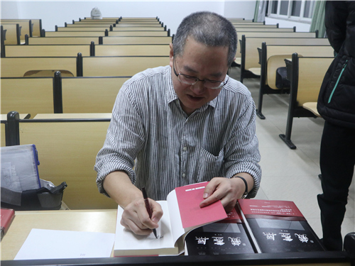紧接着,庞老师谈了谈自己的作品《无尽藏》。回忆起这本书的创作历程,他颇有体会地说道:“作家对文学要有极致的追求,应警惕写作自由,不要只是追求字数上的增长。”讲到兴起时,庞老师还向同学们展示了书的扉页,和大家讲了讲书中的故事。他指出,自己这部作品里的历史是真实存在的,大量的史料阅读让这本书有了扎实的存在感。在说到历史小说的写作时,庞老师还结合当下写作发展进入了自媒体时代的现实,提醒同学们要敬畏文字,尤其是对历史题材的作品,要有自己的标准和鉴别力。在大家都很关心的《无尽藏》创作灵感问题上,他真诚地与同学们说道:“对史料研究要扎实,这样就会慢慢地发现让自己惊喜的情节,再结合新的角度、一定的技巧和合适的语言表达,最终就雕琢出了这部作品”除此之外,他还强调,写历史小说时,当代感很重要,要把作品与当代文化对应起来。偶然提起中外文学作品的比较,庞老师提出我们要做到“中国故事,国际表达”。