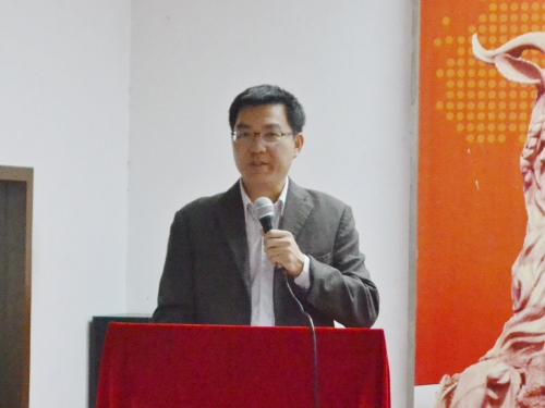 视频播放完毕后,学工办主任冯健生老师进行16-17学年学生工作总结。他明确提出“以生为本,德育为先,培养合格的社会主义接班人”的理念,强调从思想教育、学风教育和校园教育三个方面使学生获得全方面的发展。另外,他表示学院为了进一步落实学生工作,开展了团课教育、优良学风班以及领导、教授联系班级等活动。除此之外,冯老师还提到学生工作的开展离培养社会主义接班人这一目标仍有很大的差距,并告诫广大学子要牢记使命,刻苦求学,追求卓越。