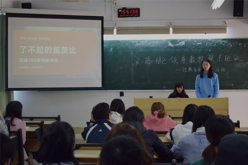 副院长王凤霞老师与汉语182班全体同学参加了本次活动。此次活动以座谈会的形式就经典书目《了不起的盖茨比》进行了交流分享。