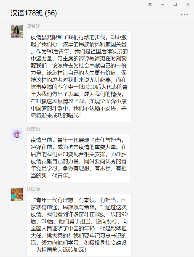 各级各班通过仔细阅读习近平总书记的回信、了解青年志愿者奔赴战“疫”一线的故事等形式进行学习,牢固树立同学们彻底战胜疫情的坚定信心,引导同学们在为人民服务中茁壮成长。
