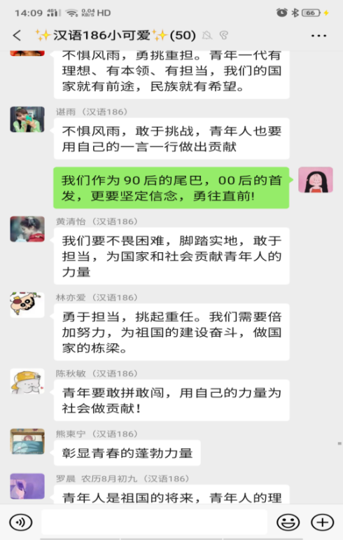 汉语198班第一班主任王琼书记参与主题班会,赞扬同学们在主题班会上的精彩发言,鼓励同学们争做有本领、有担当的青年一代,她相信当代青年定能肩负重任、勇往直前。