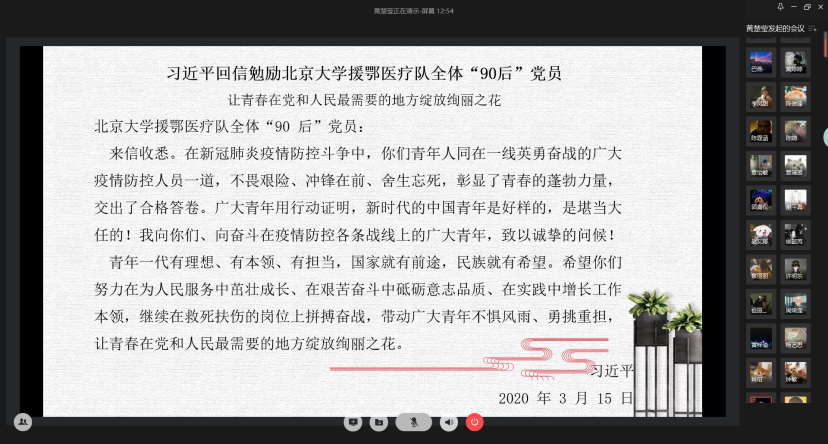 各级各班围绕“习近平总书记给北京大学援鄂医疗队全体‘90后’党员的回信”为主要学习内容拟定主题召开线上学生政治学习班会。在本次线上政治学习班会中,吃瓜网