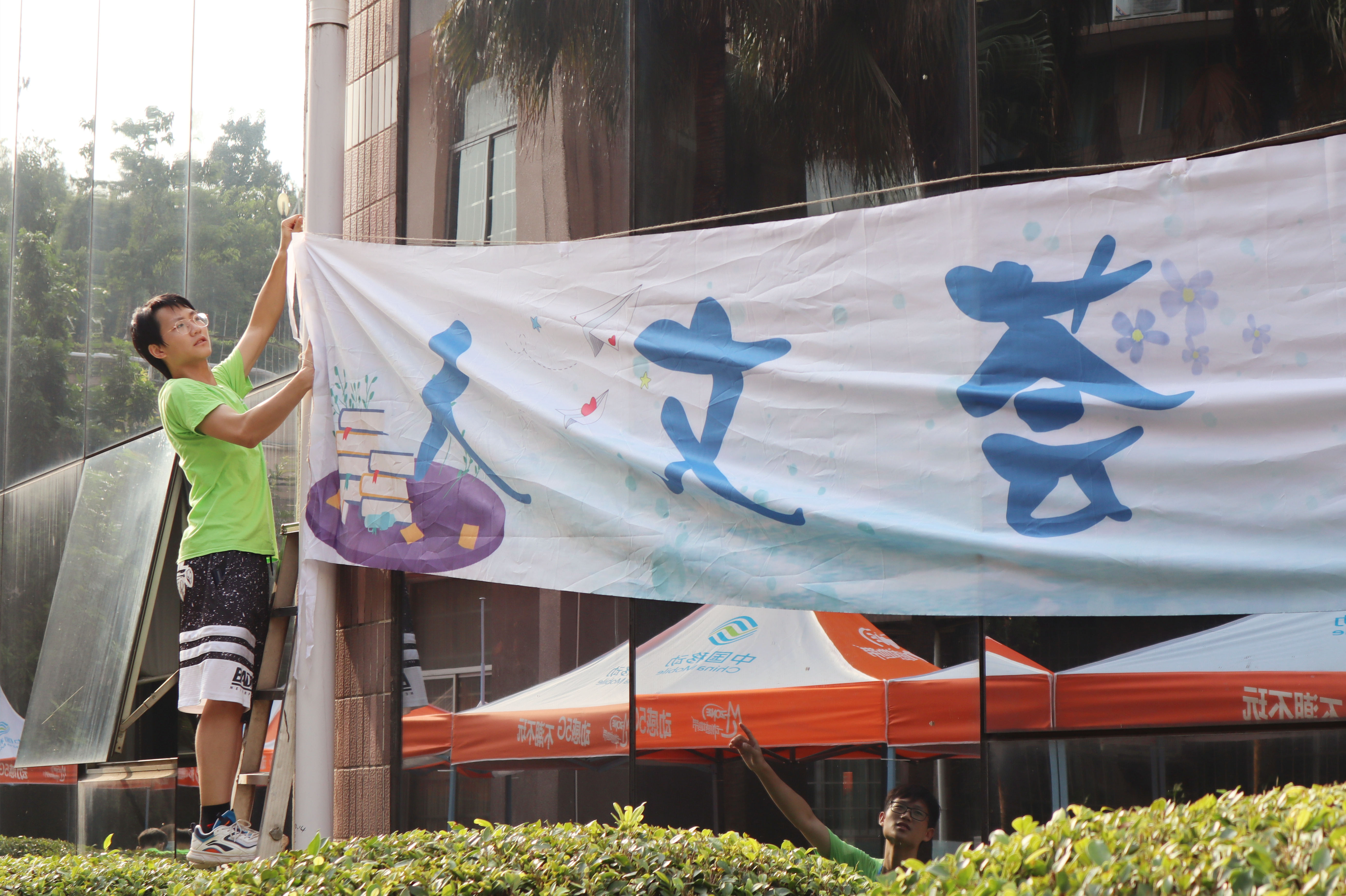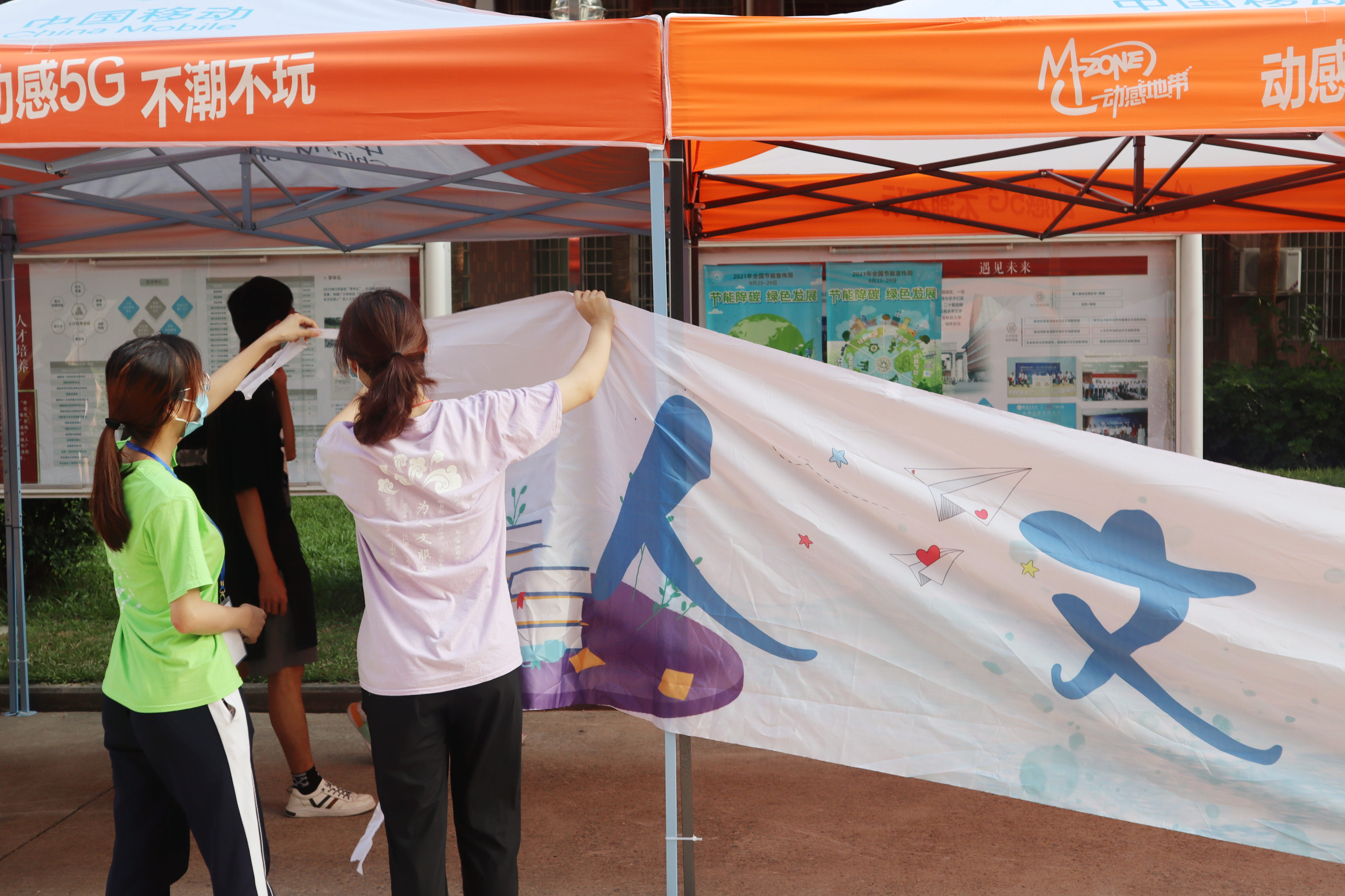 晨曦初露,在21级新生们踏入校园之前,工作人员早已前往现场,为迎接他们的到来做最后的准备。张贴横幅、整理桌椅、搬运物资……即使汗水打湿了他们的衣襟,他们依旧不辞辛苦地奔波着。