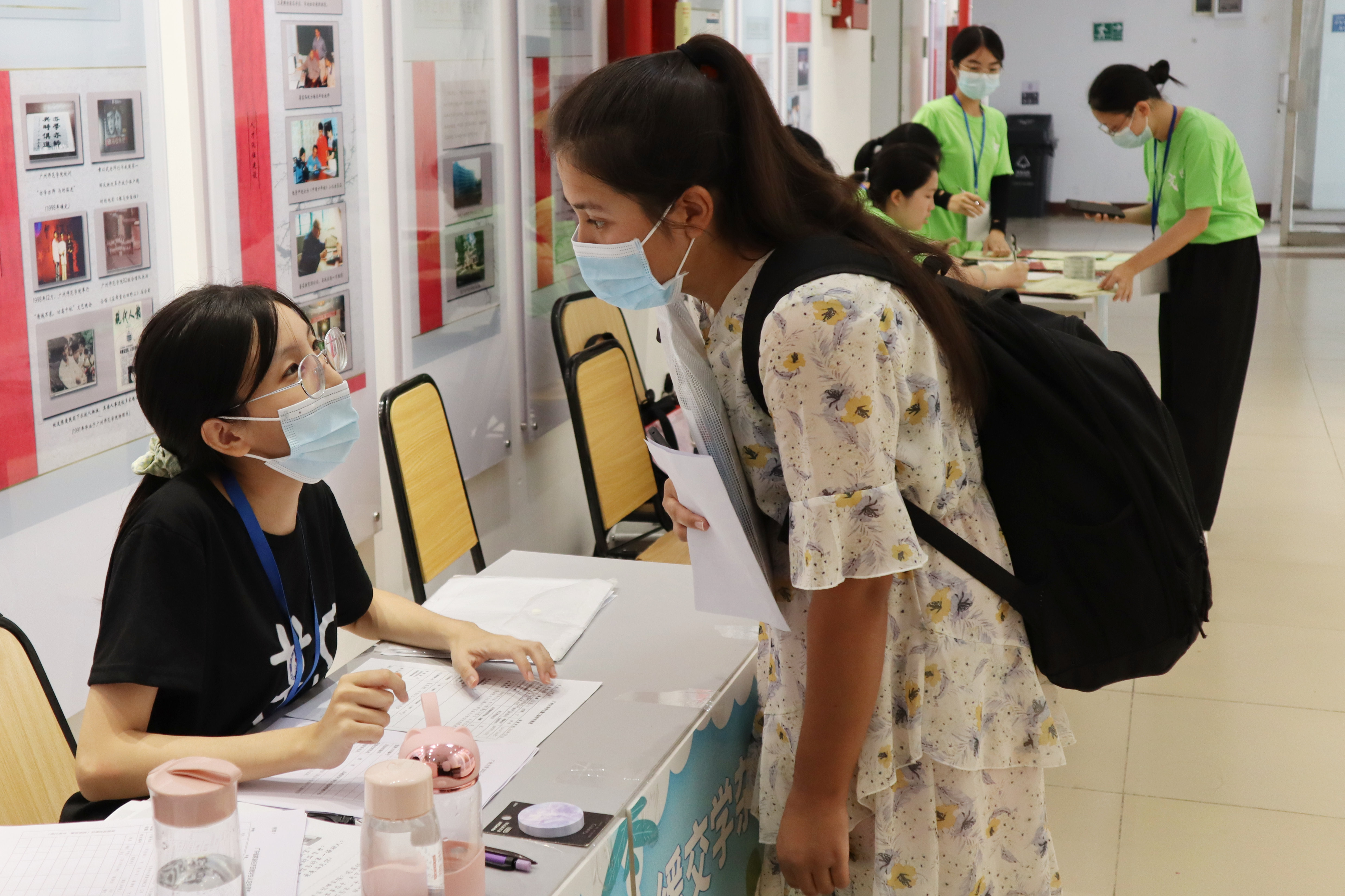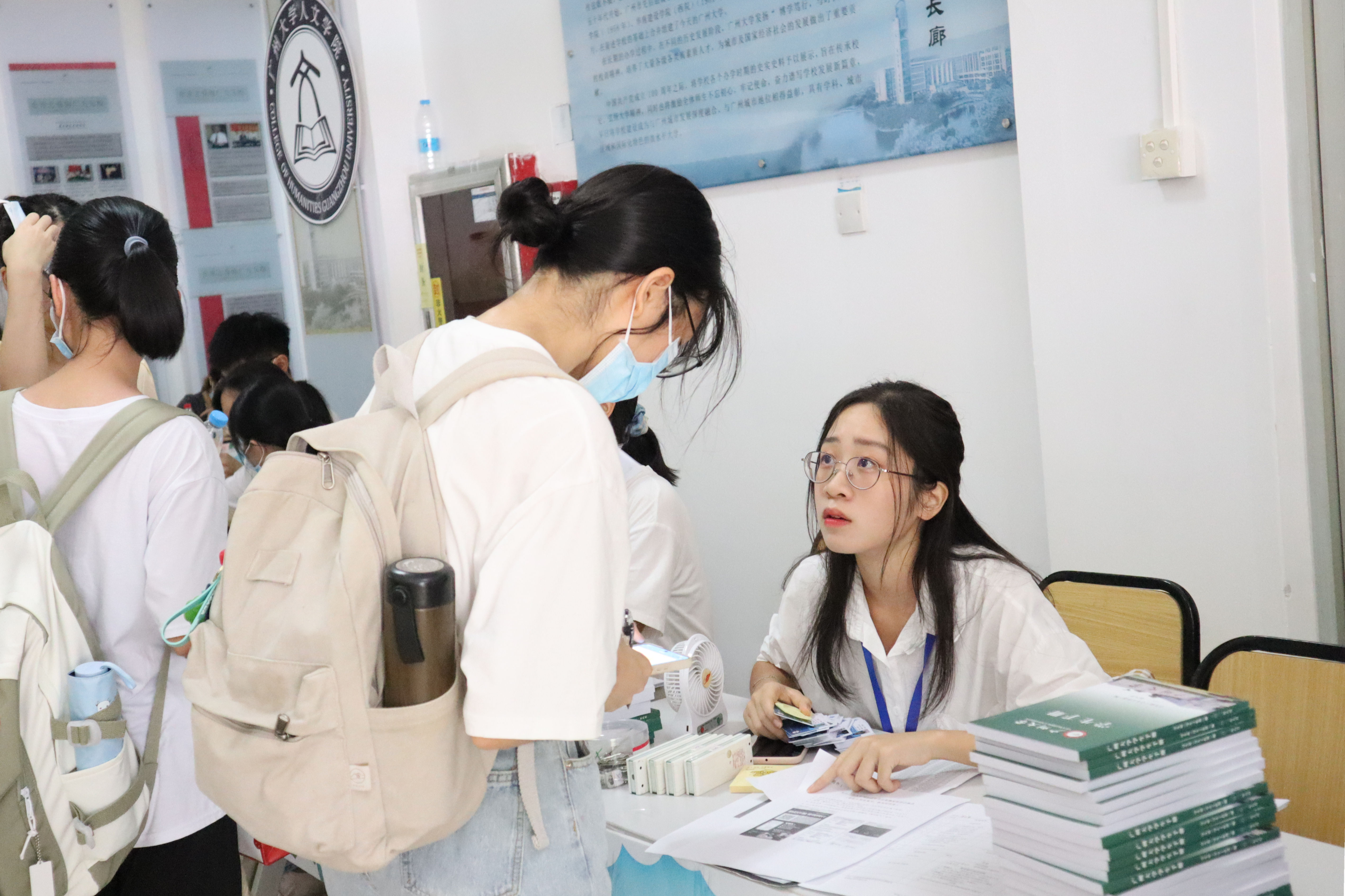 迎新工作人员在桂花岗校区图书馆一楼阅览室外大厅设立了新生报到接待点,学校和学院领导、老师们也前往新生接待现场,指导迎新工作。