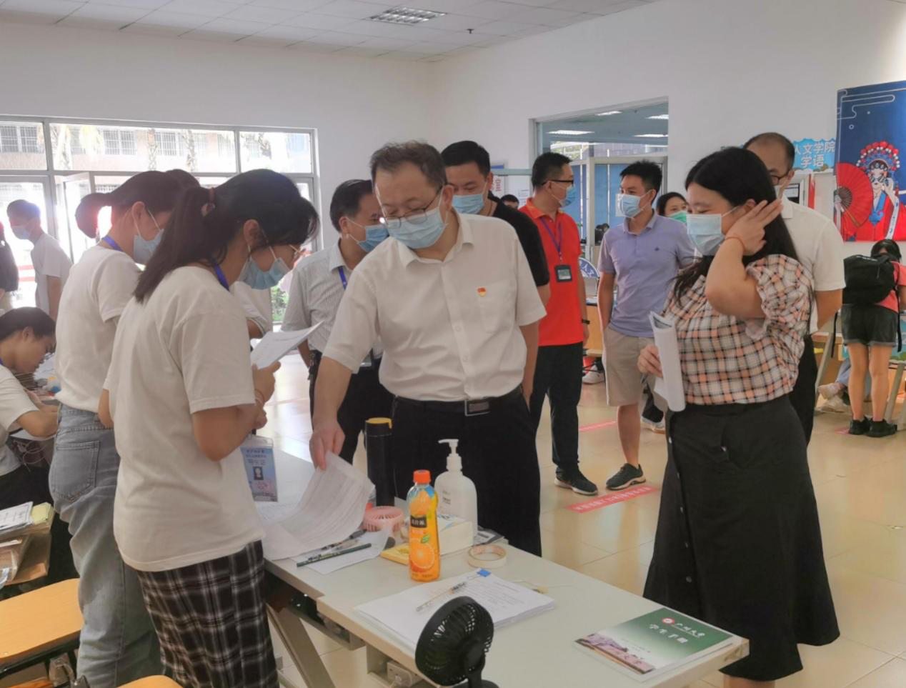 报到点,欢迎新生入校,了解关心新生安顿情况,提醒大家遵守学校防疫规定,做好个人防护。同时,他们鼓励同学们要做好合理规划,尽快调整学习状态,投入到大学的学习之中。