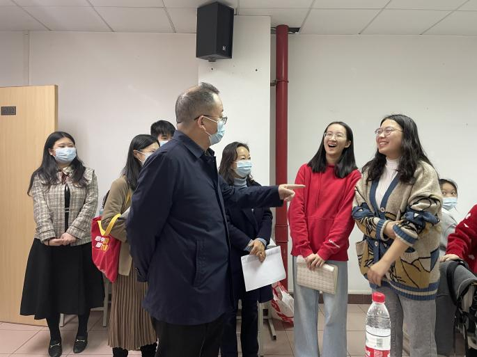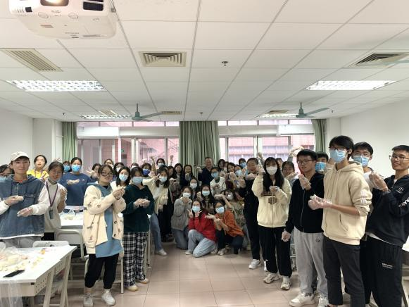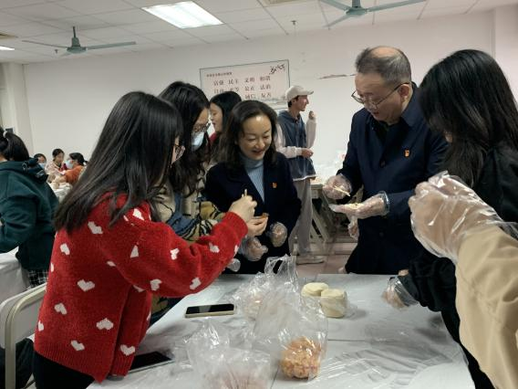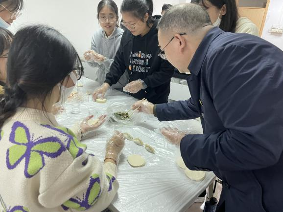 最后,是本次活动的重头戏“包饺子”环节,屈书记走到同学们中间,与同学们一起交流,一起包饺子。屈书记为同学们包了第一个“糖饺子”,表达了对同学们满满的祝福和期盼。