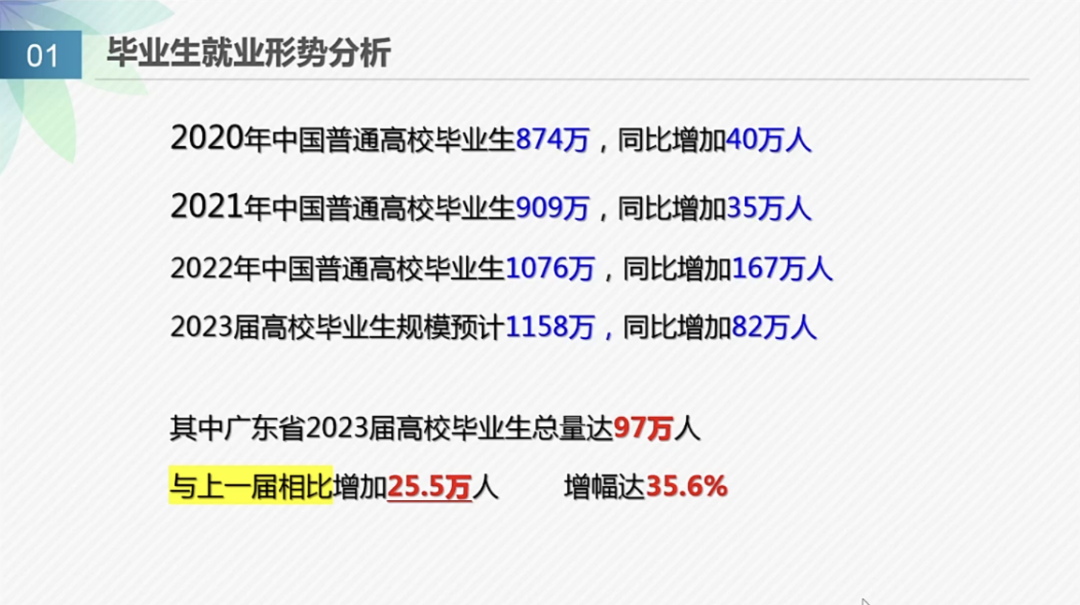 随后,邱锦泉老师从高校毕业生人数、就业政策两个方面分析现今普通高校毕业生的考研热、就业难的原因,向同学们介绍了学院近4年的毕业生初次就业率和毕业生就业去向分布等详细数据,涉及教师岗位、公司企业、升学以及出国留学等多种情况。
