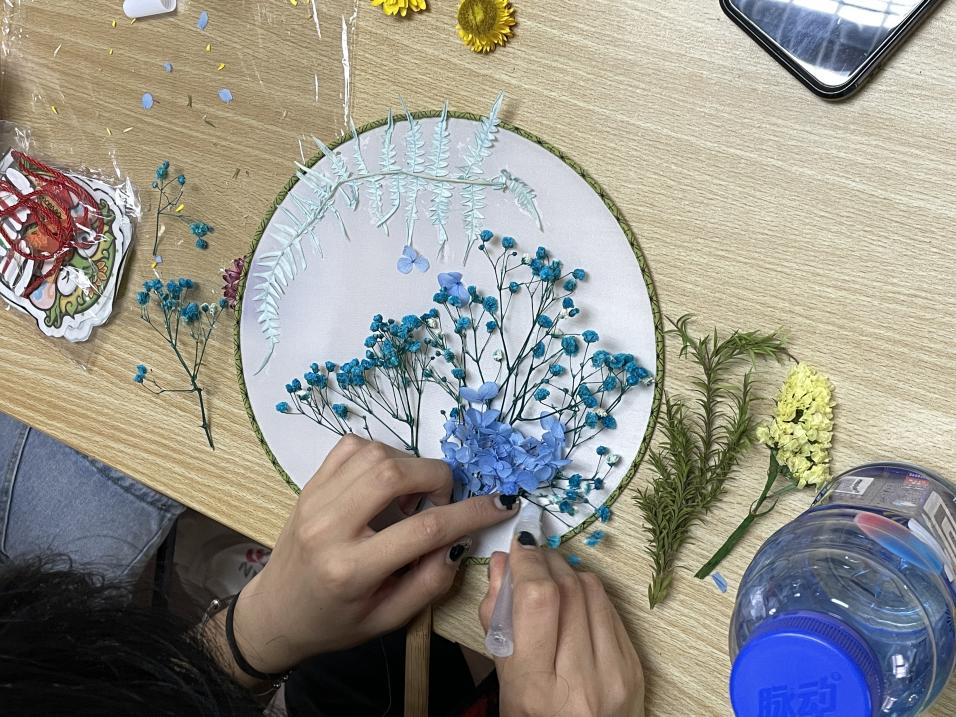 在初步了解古代团扇的制作工艺及特点后,同学们便紧锣密鼓地运用所学装饰扇面。