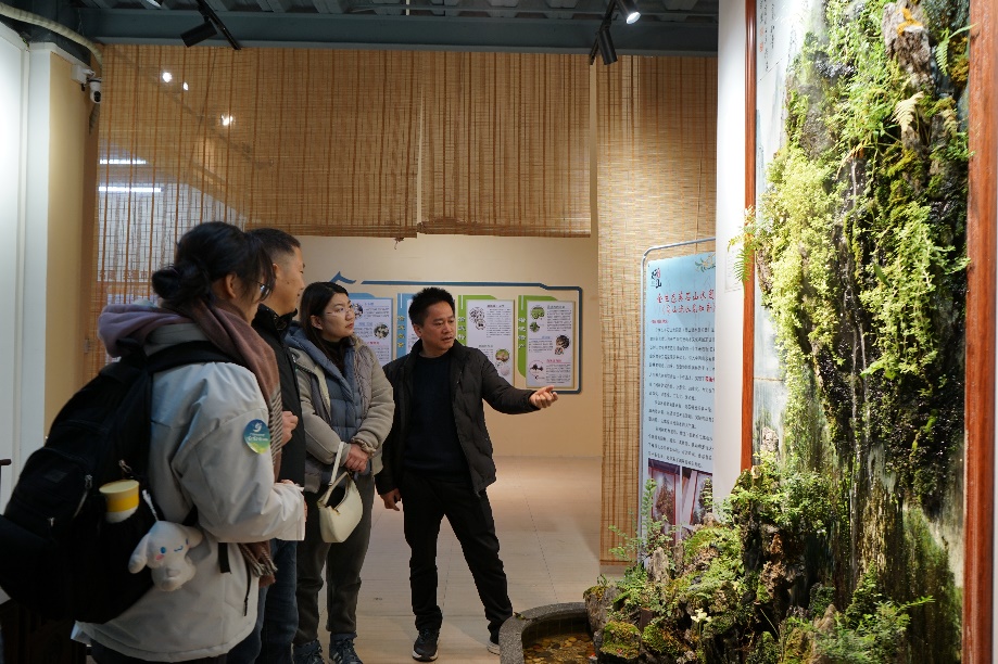 (英石假山盆景制作技艺传承彭伙强先生为团队成员介绍作品)
