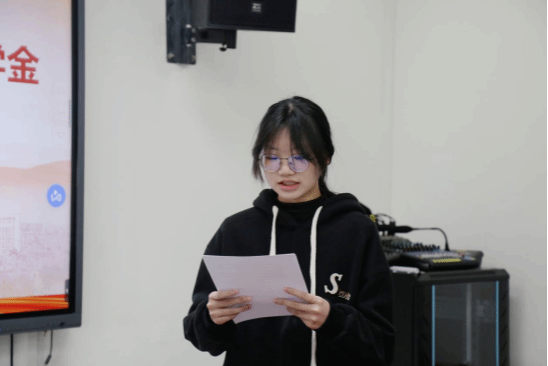 学生代表林敏茹同学发言,她向学院领导、老师和“五六点”教育及王浩兵校友的资助表达衷心的感谢和崇高的敬意,随后,她动情地讲述了自己励志求学的经历和成长进步的心路历程,对她而言,助学金不仅是经济上的援助,更是学习、生活和精神上的巨大鼓励与支持,是一份沉甸甸的爱和温暖,让她从中汲取了直面困难、不断成长的力量与勇气。她真诚表示将珍惜助学金,合理规划,自觉抵制奢侈消费,认真学习专业基础知识,把才学转化为实干,接力传承好这份大爱,矢志奉献、担当实干,以实际行动回报母校、回报社会,展现新时代青年的责任与担当。