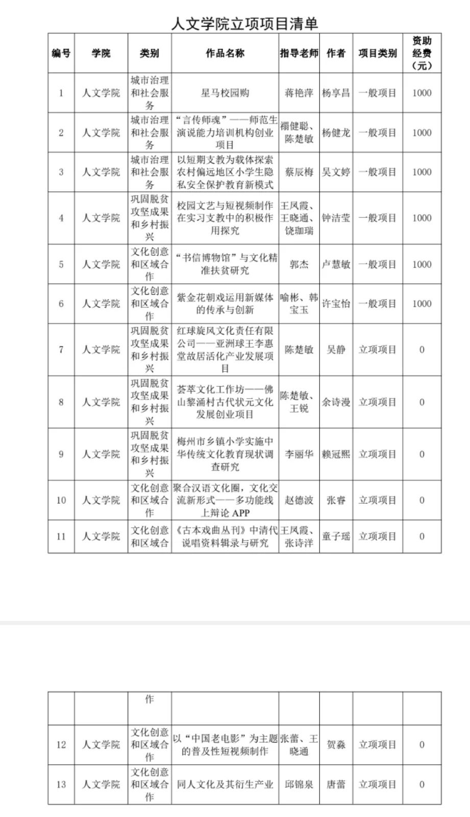 为进一步引导广大青年学生树立创业精神,培养创新意识,提高就业能力和创业能力,在全校营造氛围浓厚的科技创新创业氛围,学校自2021年3月起组织开展了2021创业项目立项申报工作,人文学子认真准备,积极参与申报,取得了优异的成绩,共有13个项目获得校级立项,其中,获得校级一般立项的项目有《星马校园购》等6项,《红球旋风文化责任有限公司——亚洲球王李惠堂故居活化产业发展项目》等7个项目获得校级立项项目。
