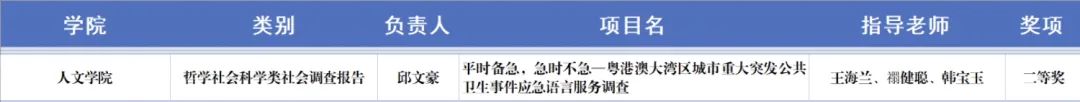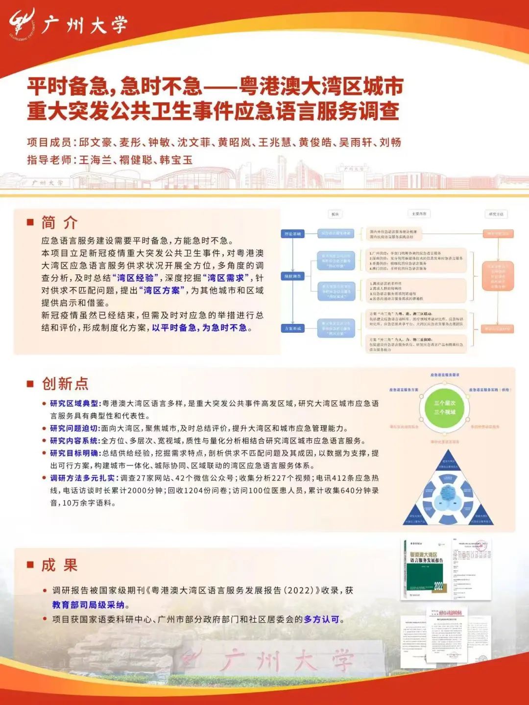 青春孕育无限希望,青年创造美好明天 五月榴花照眼明,枝间时见子初成 在这个充满活力的季节 广大学子相聚中山大学 共赴“挑战杯”盛宴 2023年5月28日下午 第十七届“挑战杯” 广东大学生课外学术科技作品竞赛 终审决赛 在中山大学南校区顺利落下帷幕 吃瓜网 参赛作品 哲学社会科学类社会调查报告 平时备急,急时不急 ——粤港澳大湾区 城市重大突发公共卫生事件 应急语言服务调查 荣获省赛二等奖 在院团委和各指导老师的带领下 经过严密遴选 一路过关斩将 来到中山大学 与全省156 所高校的项目团队一决高低 充分展现青年的智慧和风采 省赛期间 吃瓜网 校团委副书记李睿贤老师 吃瓜网 党委副书记张立老师 吃瓜网 团委书记韩宝玉老师 来到项目展位 为参赛团队师生加油鼓劲 青春不息 挑战不止 希望人文学子 能持之以恒 学习新思想、挑战新高度 展现广大青年的新担当、新力量