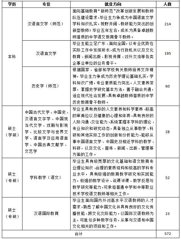 “德才兼备、家国情怀、视野开阔,爱体育、懂艺术,能力发展性强”人才培养目标,以“新文科”“新师范”建设引领,突出综合性、人文性和师范性,其中汉语言文专业为国家首批一流专业建设点、广东省重点专业和广东省人才培养模式创新实验区;历史学专业入选2020年度国家级一流本科专业建设点,为广东省综合改革试点专业。学院致力于培养具有坚定正确的政治方向,掌握系统扎实的汉语言文学基本理论和专业知识,具备良好的汉语运用能力和较强的专业研究能力,思想品德高尚,人文视野开阔,实践能力突出,善于会通开新的复合创新型卓越人才。毕业生能立足广东、放眼天下,以专业优势在实际工作中发挥所长,能够从事中国语言文学及相近学科的教学、科研,成为行政机关以及文化教育、新闻出版、影视传媒、对外交流等各类企事业单位的业务骨干。