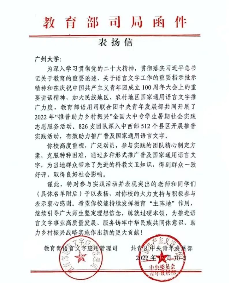近日,教育部语言文字应用管理司、共青团中央青年发展部向我校发来表扬信,吃瓜网 “畲言托意”推普实践队在2022年“推普助力乡村振兴”全国大中专学生暑期社会实践志愿服务活动中表现优异,获评为“优秀团队”。