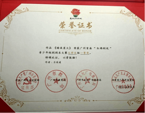 吕宛凌《暗夜星火》,获大学生组剧本大赛一等奖;