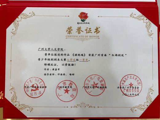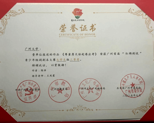 陈泽《粤童詹天佑赴港应考》(指导老师:王凤霞),获大学生组剧本大赛三等奖。