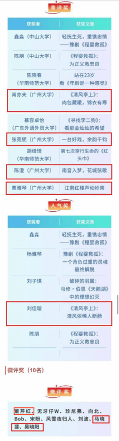 戏剧与影视24级研究生陈澄《南音入梦,花城弦歌》、戏剧与影视24级研究生曹雅琴《江南红楼声动岭南》、戏剧与影视24级研究生张苑铌《一台好戏,余韵千钧》、戏剧与影视25级研究生肖亦夫《〈清风亭上〉:肉包藏暖,锦衣有寒》获青评奖;戏剧与影视24级研究生刘佳璇《〈清风亭上〉:清风依稀人断肠》获人气奖;戏剧与影视25级研究生马晓斐、吴晓阳,23级汉语言文学专业本科生董芹红获微评奖。