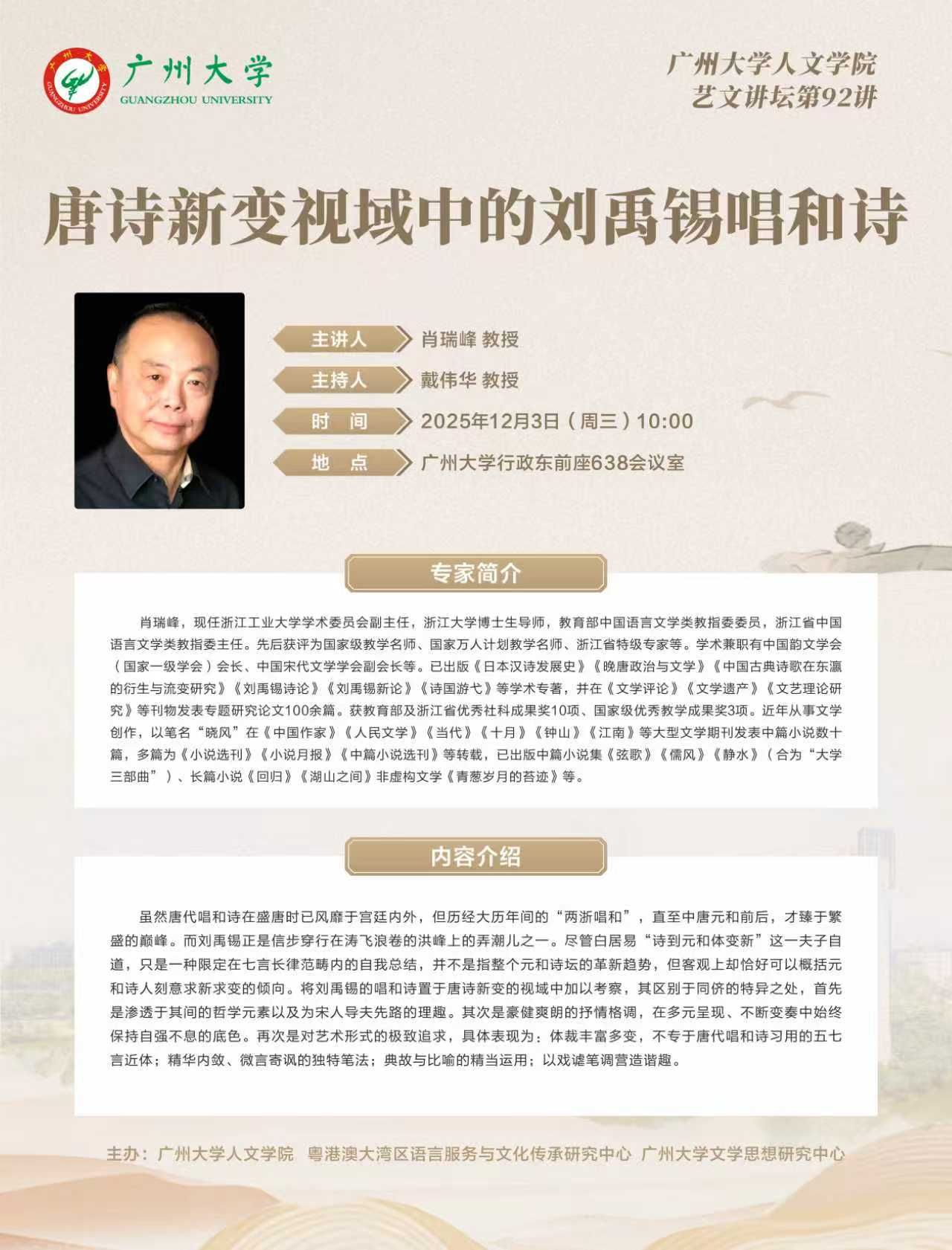 讲座预告丨肖瑞峰:唐诗新变视域中的刘禹锡唱和诗