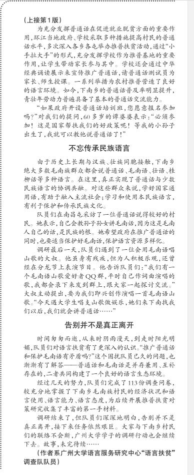 语言服务研究中心组织师生团队奔赴新疆、西藏、广西等少数民族地区开展语言扶贫调研活动。2018年10月17日正值国家扶贫日,《语言文字报》对广西调研分队开展的语言调查进行了报道。