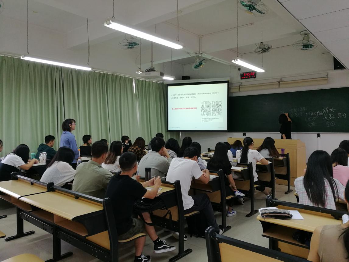 10月10日(周三)上午第一大节,戏剧与影视学系张蕾老师主讲的公开课《西方戏剧史》在文新516教室举行。学校教学督导徐国苓老师、学院党委副书记刘军军老师到场听课,戏剧与影视学系副主任王晓通、朱洋洋等老师,以及文学系、历史系十余位青年教师共同参与现场观摩。张蕾老师细致、生动地介绍了欧洲中世纪戏剧的主要形态,对代表作品的蕴涵作了深入浅出的解读,教学思路清晰,课件内容丰富。张老师善于运用古今中外戏剧史的具体例证,调动学生的学习兴趣,启发同学们对戏剧作品、戏剧现象的深入思考。汉语165班同学悉心听讲,课堂互动良好。