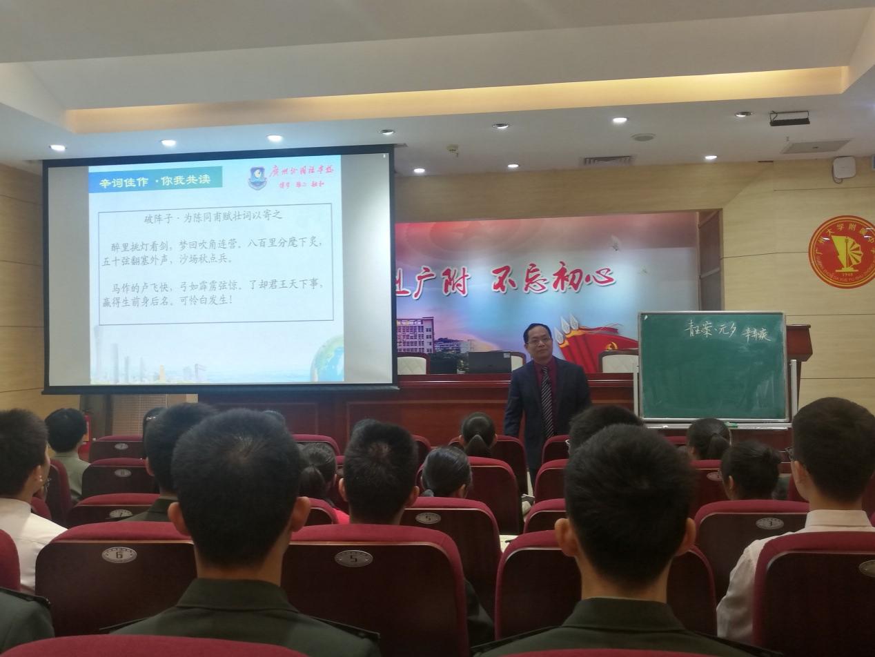 首先授课的是郭坤峰老师,他带领广大附中高二国防班学生学习辛弃疾的《青玉案•元夕》。郭老师先引领学生反复朗读辛弃疾名篇佳作,感知辛弃疾词风格;再示范诵读,让学生评价,引导学生把握本篇诗词的节奏和初步感知词中情感;在“身临其境•感受元夜” 环节,郭老师通过设置情景问题开展——“如果你是那位‘娥儿雪柳黄金镂,笑语盈盈暗香去’的佳人,试描述你度过了一个怎样的上元节?”巧妙的情景设置充分调动了学生们学习的积极性和主动性,他们纷纷踊跃作答,课堂气氛一下子活跃起来了。