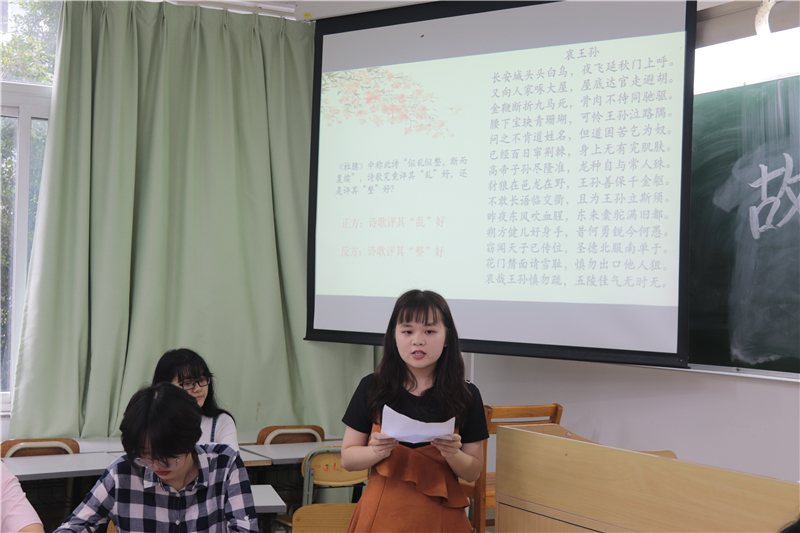 抽背环节结束后,令人期待的第二个环节——辩论赛也在同学们的掌声中拉开序幕。辩论赛一共有两轮,辩题分别是“对《哀王孙》这首诗评其‘整’好还是评其‘乱’好”和“‘吴楚东南坼,乾坤日夜浮’中的‘浮’字应该读作‘fú’还是‘fóu’”。辩论赛场上,正反双方你来我往,各抒己见,时而妙语连珠,诙谐幽默,令人捧腹;时而慷慨激昂,掷地有声,令人振奋。双方辩手清晰的思路和巧妙的陈词给观众留下了深刻印象。一场关于唐诗的辩论赛伴随着阵阵掌声走向尾声。