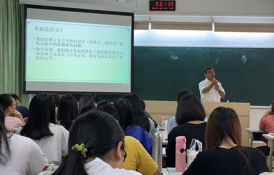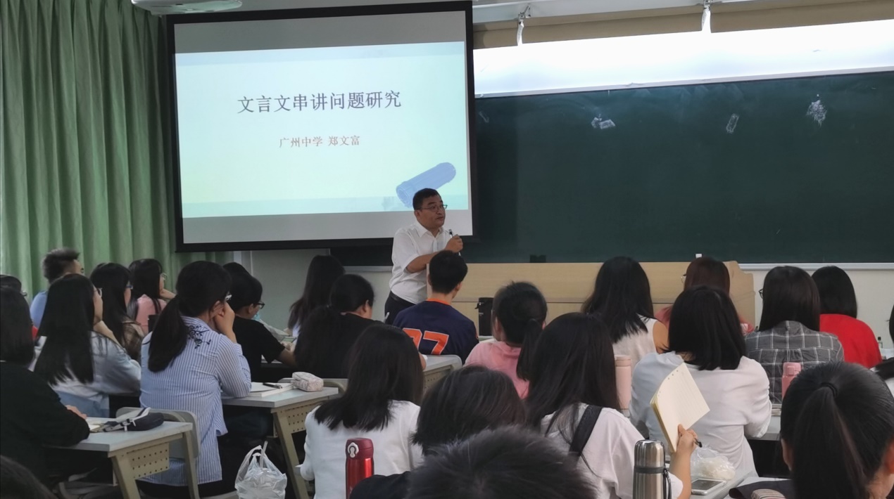 师范生的专业素养,10月15日上午,汉语言文学专业选修课“中国语文教育史”的课堂上,出现了一位“特殊”的老师:广东省优秀教师、广州中学的特级教师郑文富老师,他给汉语173班的同学讲授文言文串讲教学的传承与创新专题,汉语174班部分同学、语文教学实践工作坊(第三期)成员也抓住机会来旁听了。