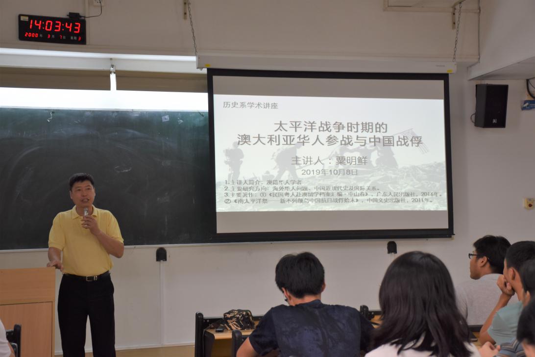 历史系举办了一场主题为“太平洋战争时期的澳大利亚华人参战与中国战俘”的学术讲座,我们有幸邀请到澳籍华人学者粟明鲜先生主讲,他的研究方向是海外华人问题、中国近现代史及国际关系等。