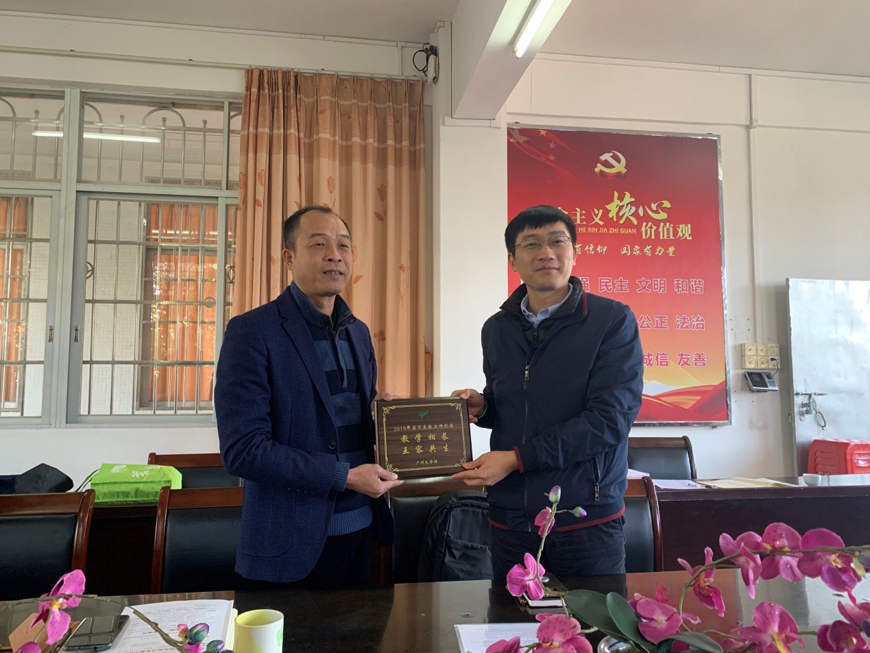 赠予吕田中学“教学相长,互容共生”的纪念牌匾,并为支教生指导老师颁发聘书。