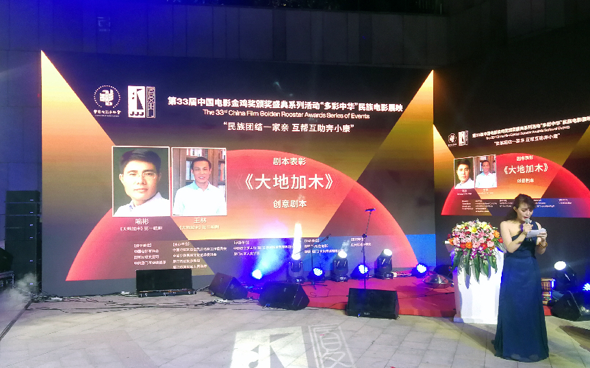 戏剧与影视学系教授喻彬与学生王林创作的电影剧本《大地加木》,获得了创意剧本奖。喻彬参加了颁奖典礼并上台领奖。