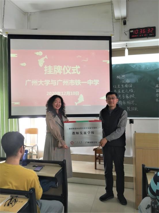 代表禤健聪院长为广州市铁一中学校方代表陈雯老师颁发“协同创建国家教师教育创新实验区教师发展学校”牌匾,双方互相致谢并分别对未来两校有关教师教育的合作做出展望,本次交接仪式在热烈的掌声中结束。