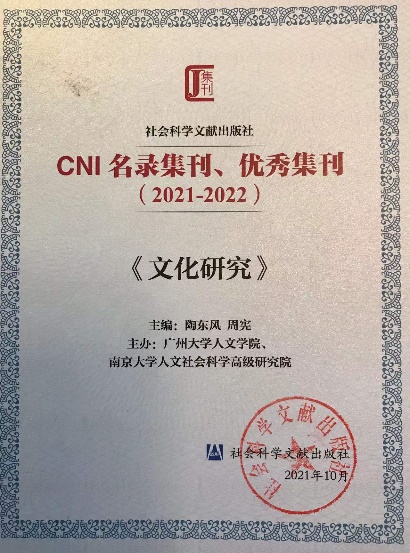 陶东风教授与南京大学社会科学高级研究院周宪教授联合主编的《文化研究》再次入选该名录,并再次荣获优秀集刊称号。