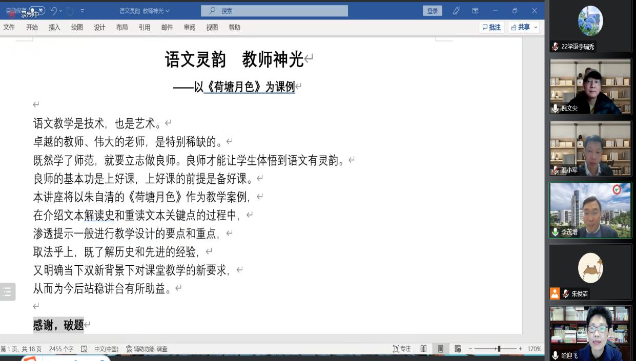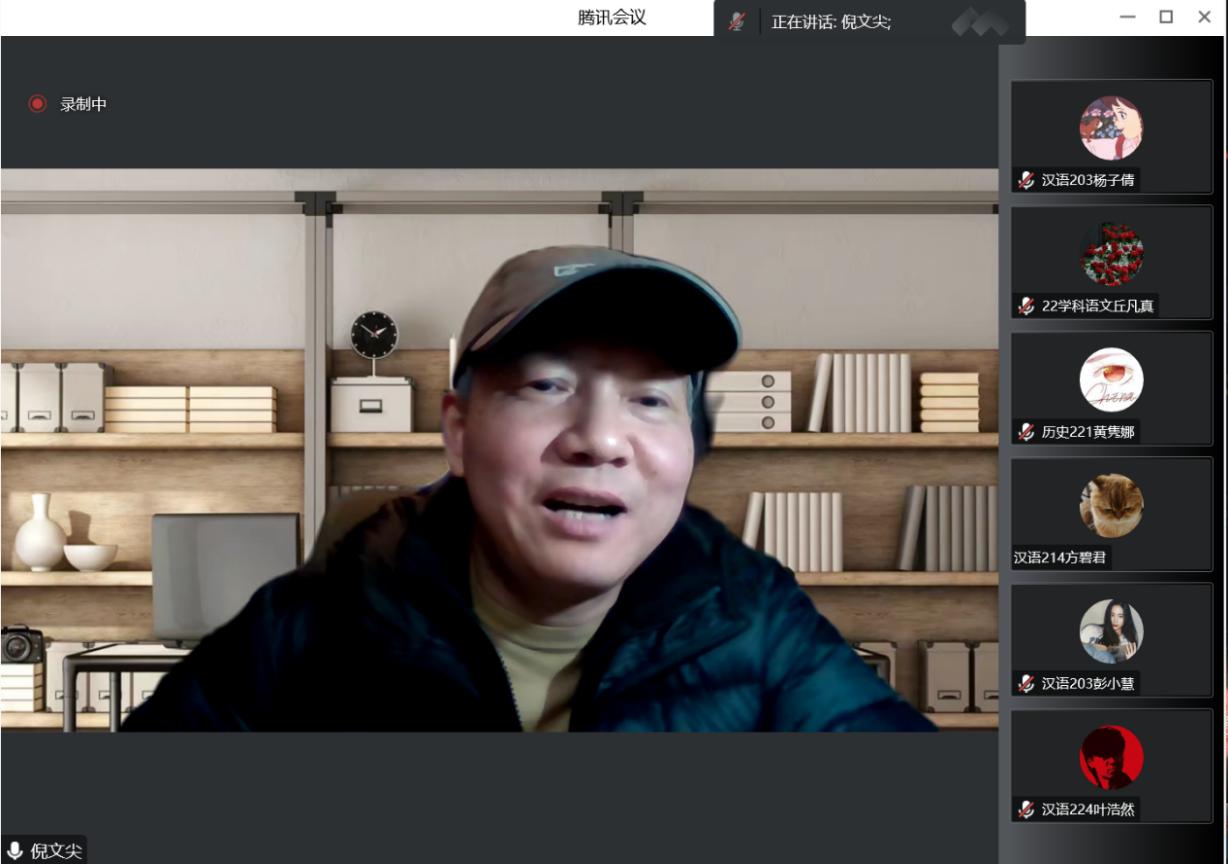 艺文讲坛第五十七讲在线上举行。华东师范大学中文系副教授、语文教育研究中心研究员倪文尖应邀作题为“语文灵韵 教师神光——以《荷塘月色》为课例”的学术讲座,此次讲座由李茂增教授主持,哈迎飞教授和温小军副教授与谈,校内外近两百余名师生参加讲座。