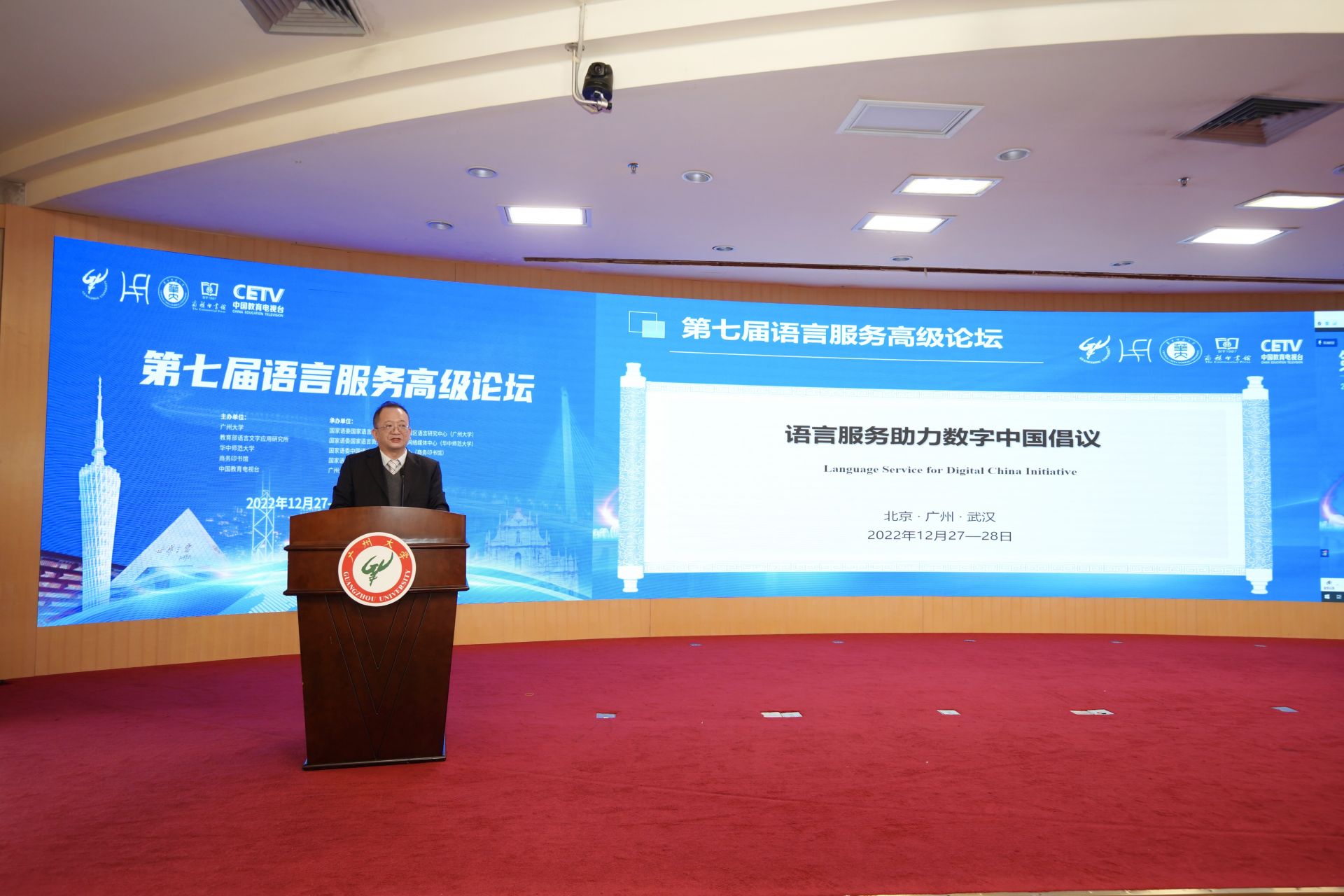12月27日至28日,第七届语言服务高级论坛在北京、广州、武汉三地联合举办。闭幕式上,教育部语言文字信息管理司、广东省教育厅指导的国家语委国家语言服务与粤港澳大湾区语言研究中心和大湾区有关学术机构、企事业单位联合发起成立“粤港澳大湾区语言生活与语言服务建设联盟”。与会语言文字工作者就语言服务助力数字中国建设形成共识。