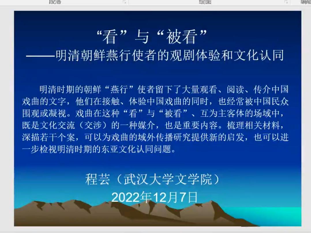 程教授进而对《燕行录》戏曲史料的记载、艺术形态以及戏曲文献的特点进行了介绍,并从文化交流、艺术体验和书籍传播等层面提出其中的文化认同问题,揭示阅读和研究《燕行录》的可能。
