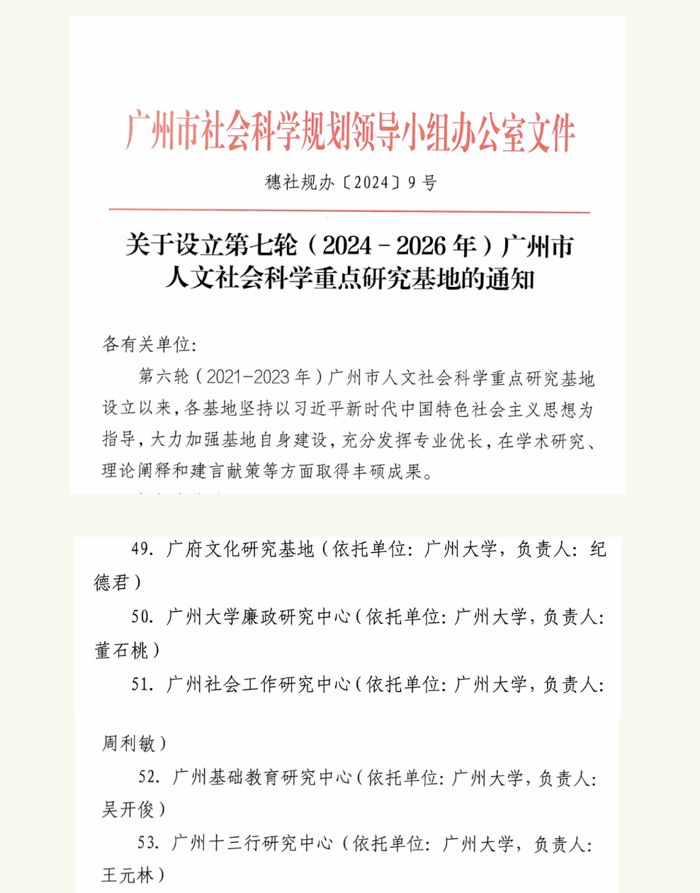 建设的广府文化研究基地(负责人为纪德君教授)、广州十三行研究中心(负责人为王元林教授)获批为第七轮广州市人文社会科学重点研究基地。两个研究基地上一轮建设中均表现出色,成功获批续建。