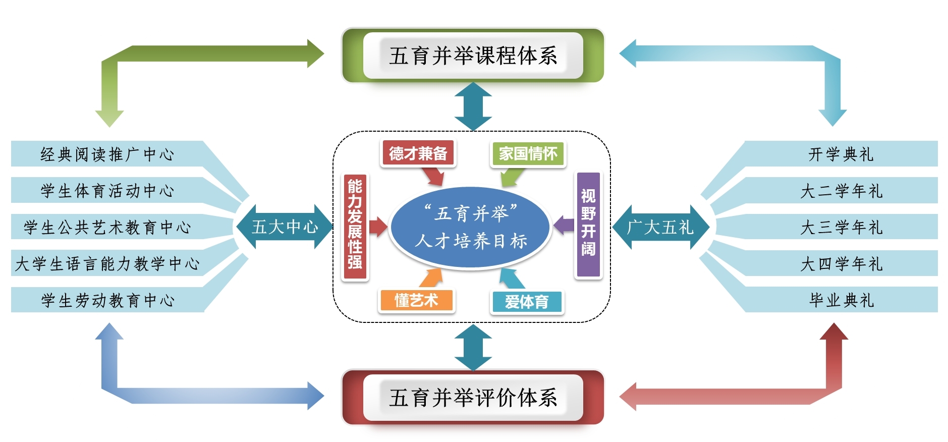 我校“五育”教育模式,秉承产出导向和学生中心理念,以24字人才培养目标为引领、以德智体美劳五大系列课程体系及文体艺阅劳等五大中心为依托、以“广大五礼”为平台、以学生素质发展评价指标体系为抓手、以“1+13+N”配套制度为保障,贯穿一至四年级全学段、覆盖全体学生,致力于实现所有学生各项素质的全面发展。